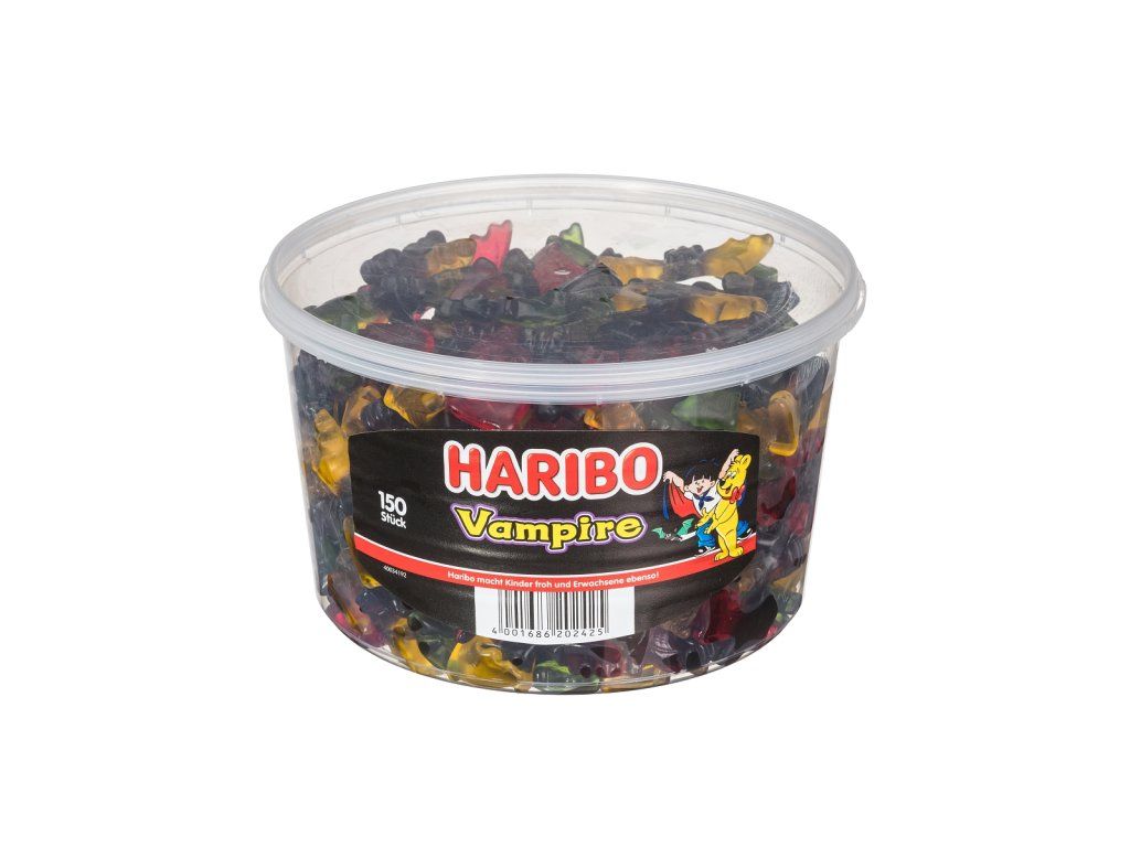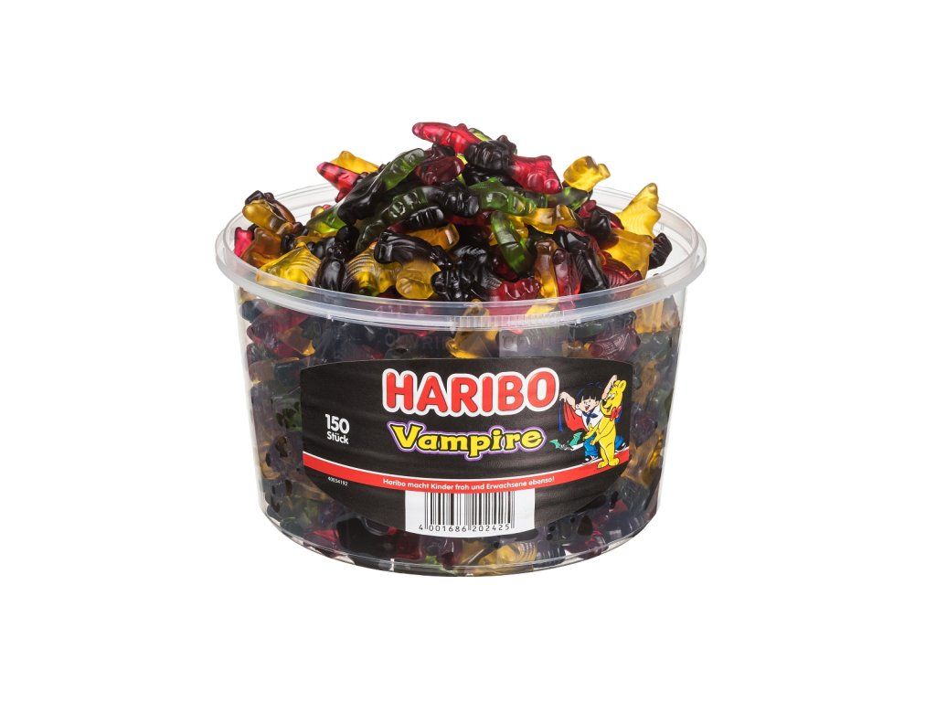Ez kezd ijesztő lenni, és ijesztően nagyszerű is! Megérkeztek a Haribo vámpír alakú cukorkák! Az édesgyökér és a gyümölcszselé nagyszerű kombinációja három különböző ízben és színben! Mi jobbat kínálhatna a vendégeknek Halloweenkor, mint ezeket a vámpírcukorkák?