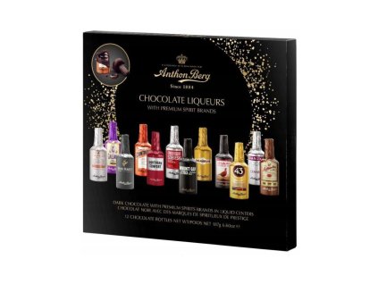 Étcsokoládé stílusos csomagolásban, minőségi alkohollal töltött palackok formájában.